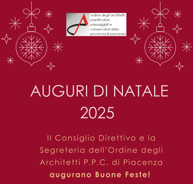 Si comunica che la sede dell’Ordine degli Architetti P.P.C. di Piacenza resterà chiusa, per il consueto periodo delle festività natalizie da mercoledì 24 dicembre 2025 a martedì 6 gennaio 2026.