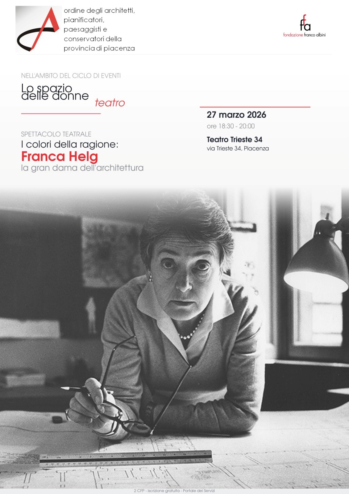 Si trasmette la LOCANDINA dello Spettacolo teatrale “I Colori della Ragione: Franca Helg la gran dama dell’architettura”, scritto e diretto da Paola Albini, che racconta il percorso esistenziale e professionale di Franca Helg (1920-1989), una delle prime donne architetto in Italia e socia dello studio di Franco Albini.
